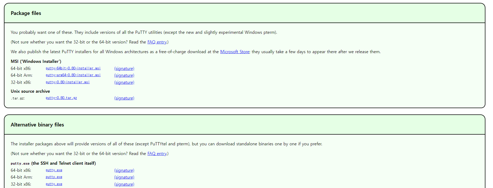 MSI, exe 파일 중 자신의 컴퓨터의 맞는 버전의 putty를 설치해준다.