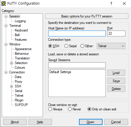 - Save : 매번 접속정보를 치고 들어가기 귀찮을 때 접속정보를 저장할 수 있다. Saved Sessions아래 입력칸에 아무 글자나 입력하고 Save버튼을 누르면 저장된다.