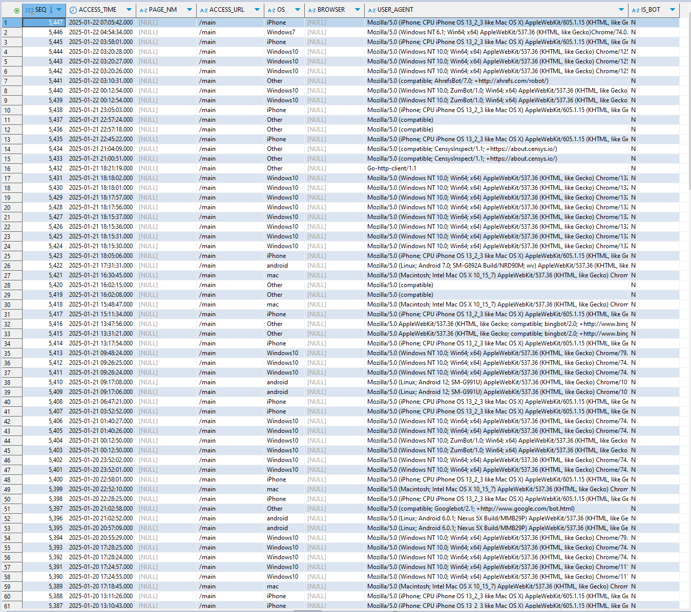 사용자가 /main 경로로 접근하면 사용자의 접속정보를 간략하게 파악하여 insertAccessLog() 매서드로 DB의 USER_ACCESS테이블에 저장하는 구조이다. 해당 테이블 확인 결과 정상적인 유저의 접속 정보와, Google, Amazon등에서 데이터를 수집할 때 사용하는 Bot의 접속정보가 함께 수집되어 실질적인 사용자의 접속정보를 구별할 수 없었다.